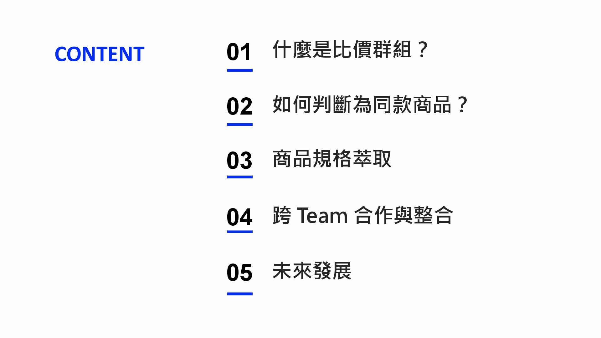 01 02 03 04 如何判斷為同款商品? 商品規格萃取 跨 Team 合作與整合 什麼是比價群組?