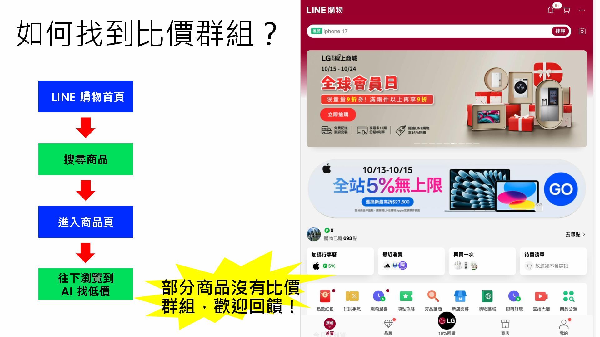 如何找到比價群組? LINE 購物首頁 搜尋商品 進入商品頁 往下瀏覽到 AI 找低價 部分商品沒有比價 群組,歡迎回饋!