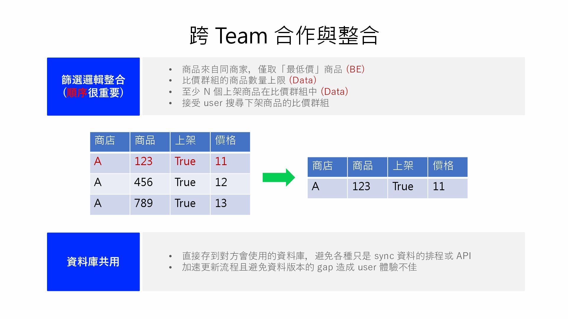 (Data) • 至少 N 個上架商品在比價群組中 (Data) • 接受 user 搜尋下架商品的比價群組 資料庫共用 • 直接存到對方會使用的資料庫,避免各種只是 sync 資料的排程或 API • 加速更新流程且避免資料版本的 gap 造成 user 體驗不佳 商店 商品 上架 價格 A 123 True 11 A 456 True 12 A 789 True 13 商店 商品 上架 價格 A 123 True 11