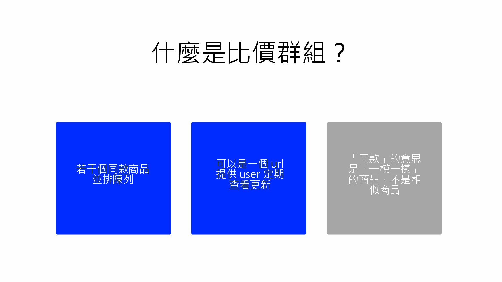 若干個同款商品 並排陳列 什麼是比價群組? 可以是一個 url 提供 user 定期 查看更新 「同款」的意思