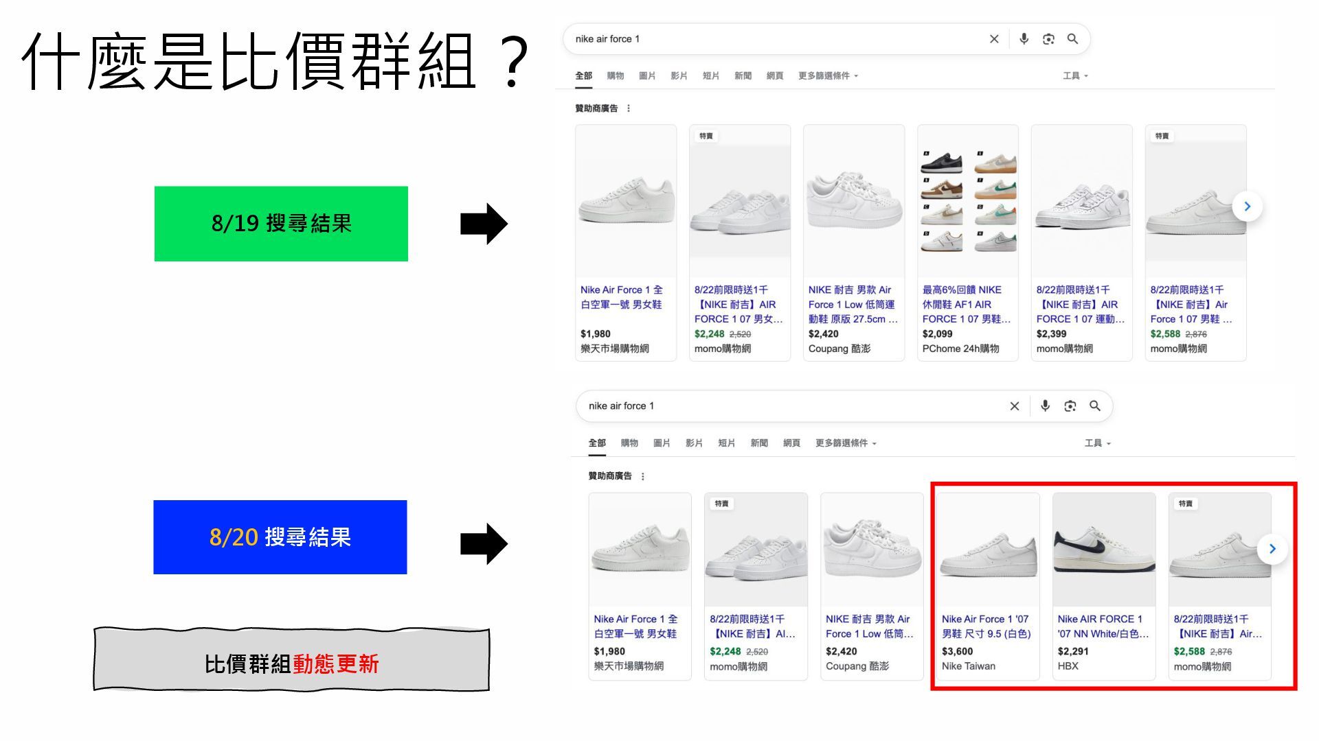 什麼是比價群組? 8/19 搜尋結果 8/20 搜尋結果 比價群組動態更新