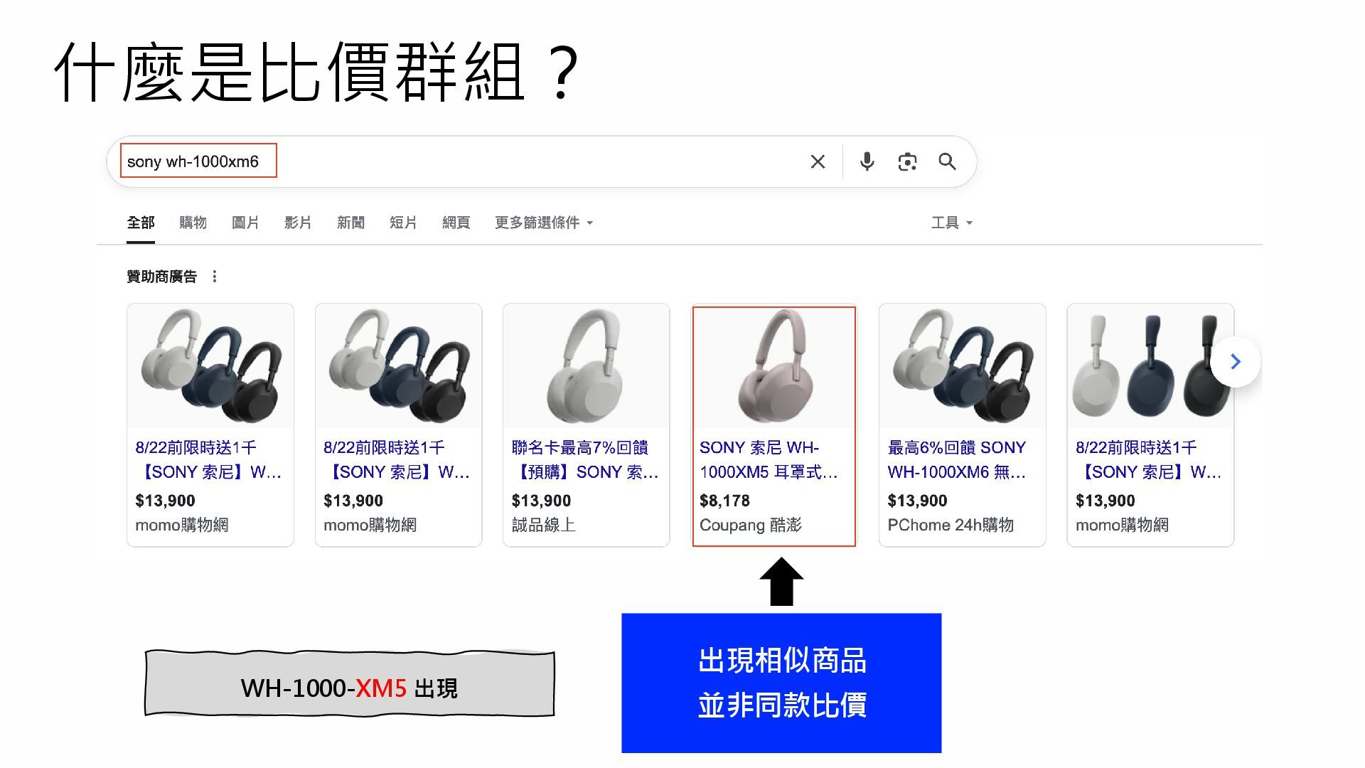 什麼是比價群組? 出現相似商品 並非同款比價 WH-1000-XM5 出現