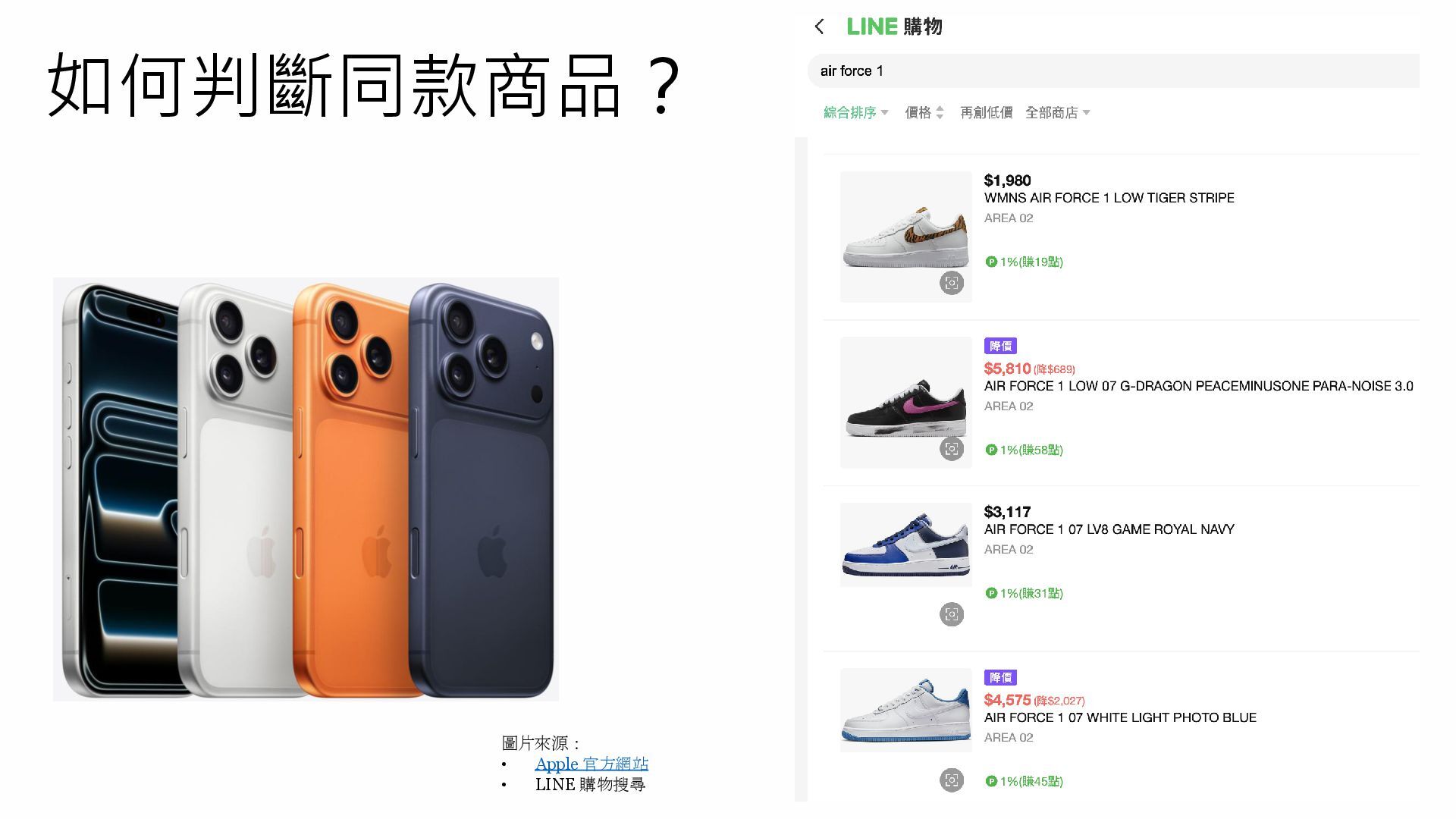 如何判斷同款商品? 圖片來源: • Apple 官方網站 • LINE 購物搜尋