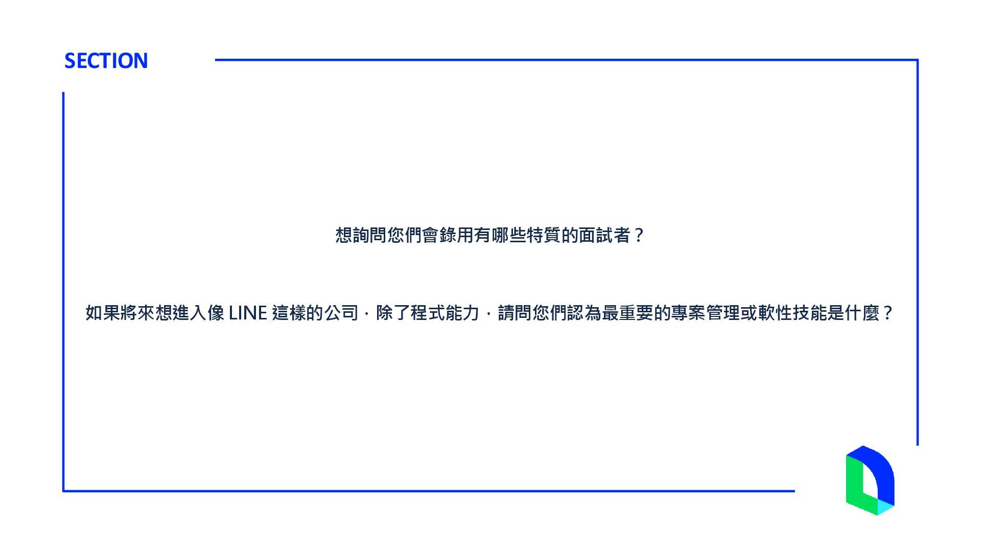 SECTION 想詢問您們會錄用有哪些特質的面試者? 如果將來想進入像 LINE 這樣的公司,除了程式能力,請問您們認為最重要的專案管理或軟性技能是什麼?