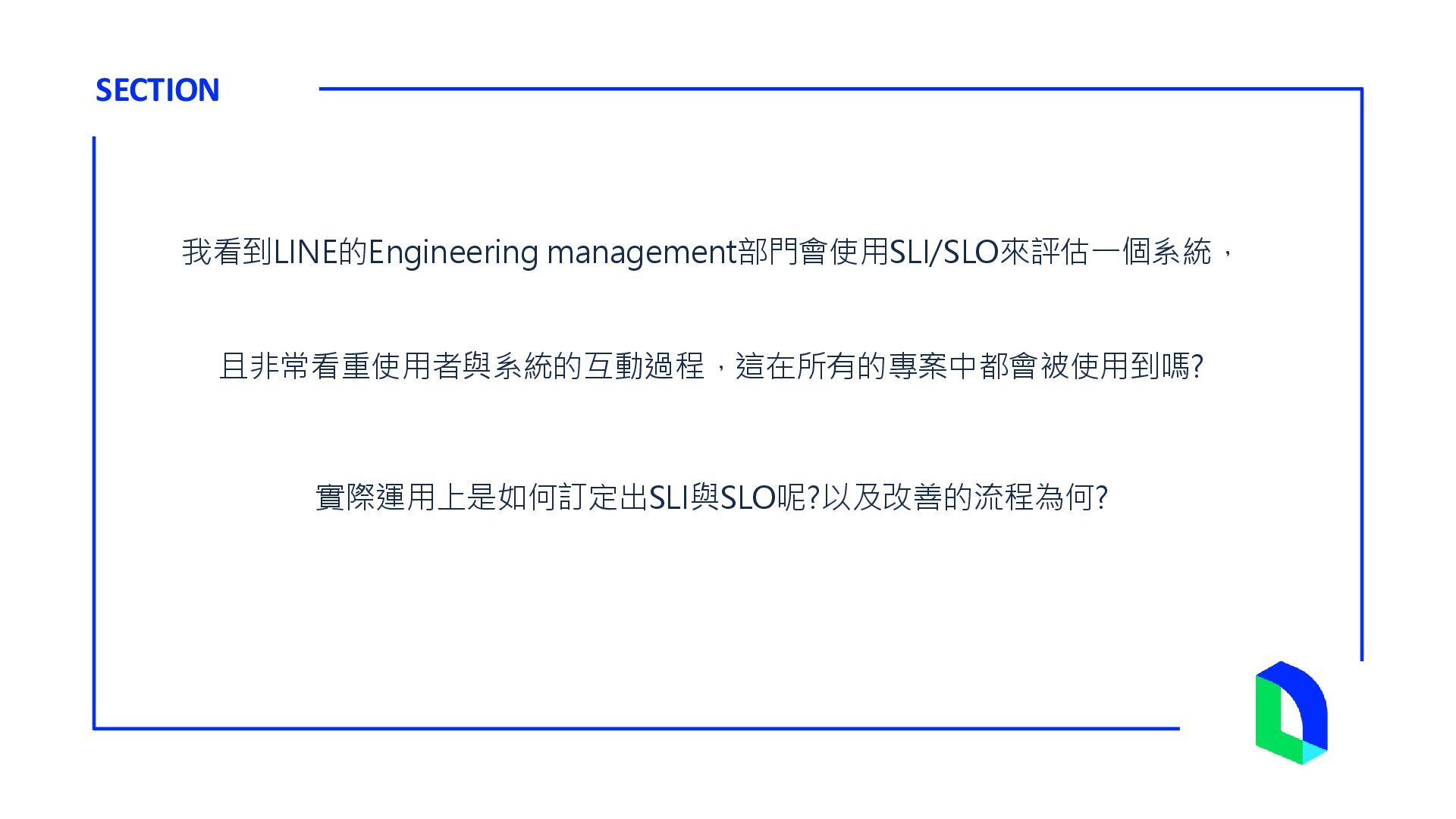 SECTION 我看到LINE的Engineering management部門會使用SLI/SLO來評估一個系統, 且非常看重使用者與系統的互動過程,這在所有的專案中都會被使用到嗎? 實際運用上是如何訂定出SLI與SLO呢?以及改善的流程為何?
