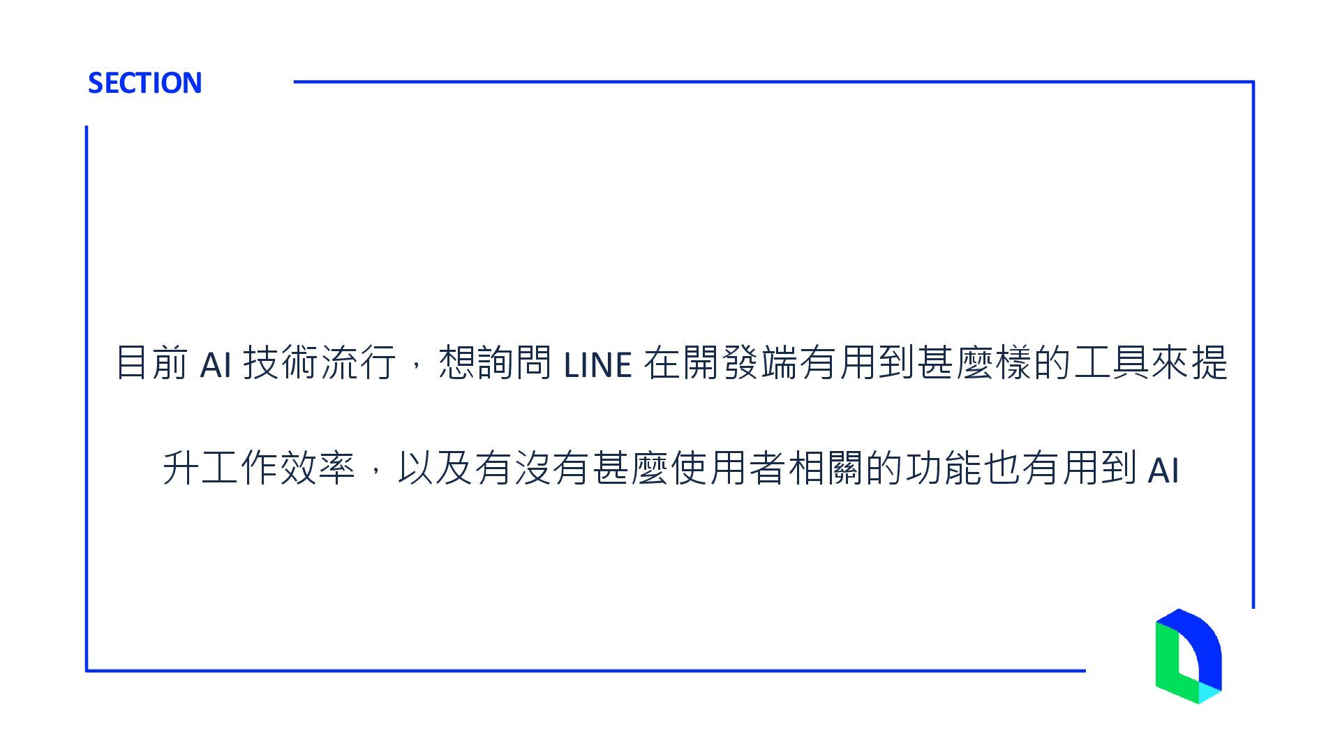 SECTION 目前 AI 技術流行,想詢問 LINE 在開發端有用到甚麼樣的工具來提 升工作效率,以及有沒有甚麼使用者相關的功能也有用到 AI