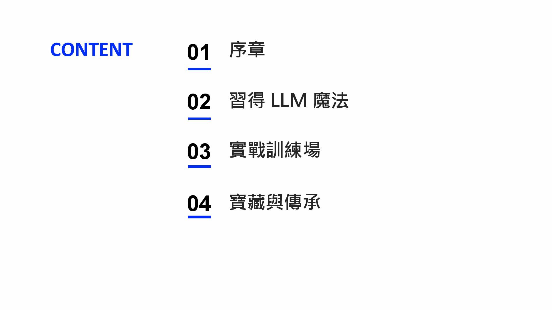 01 02 03 04 習得 LLM 魔法 實戰訓練場 寶藏與傳承 序章