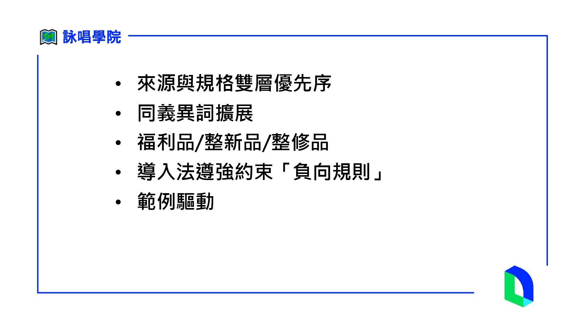 詠唱學院 • 來源與規格雙層優先序 • 同義異詞擴展 • 福利品/整新品/整修品 • 導入法遵強約束「負向規則」 •