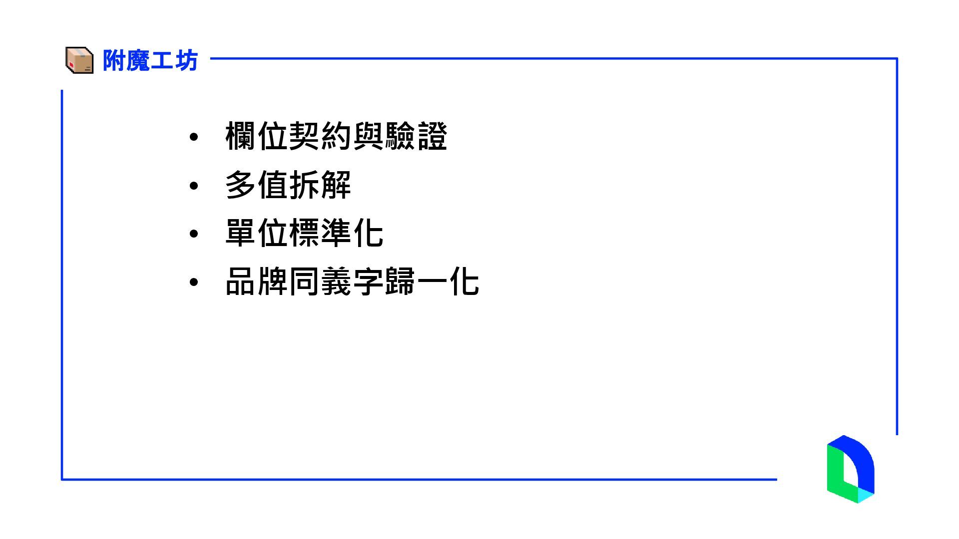 附魔工坊 • 欄位契約與驗證 • 多值拆解 • 單位標準化 • 品牌同義字歸一化