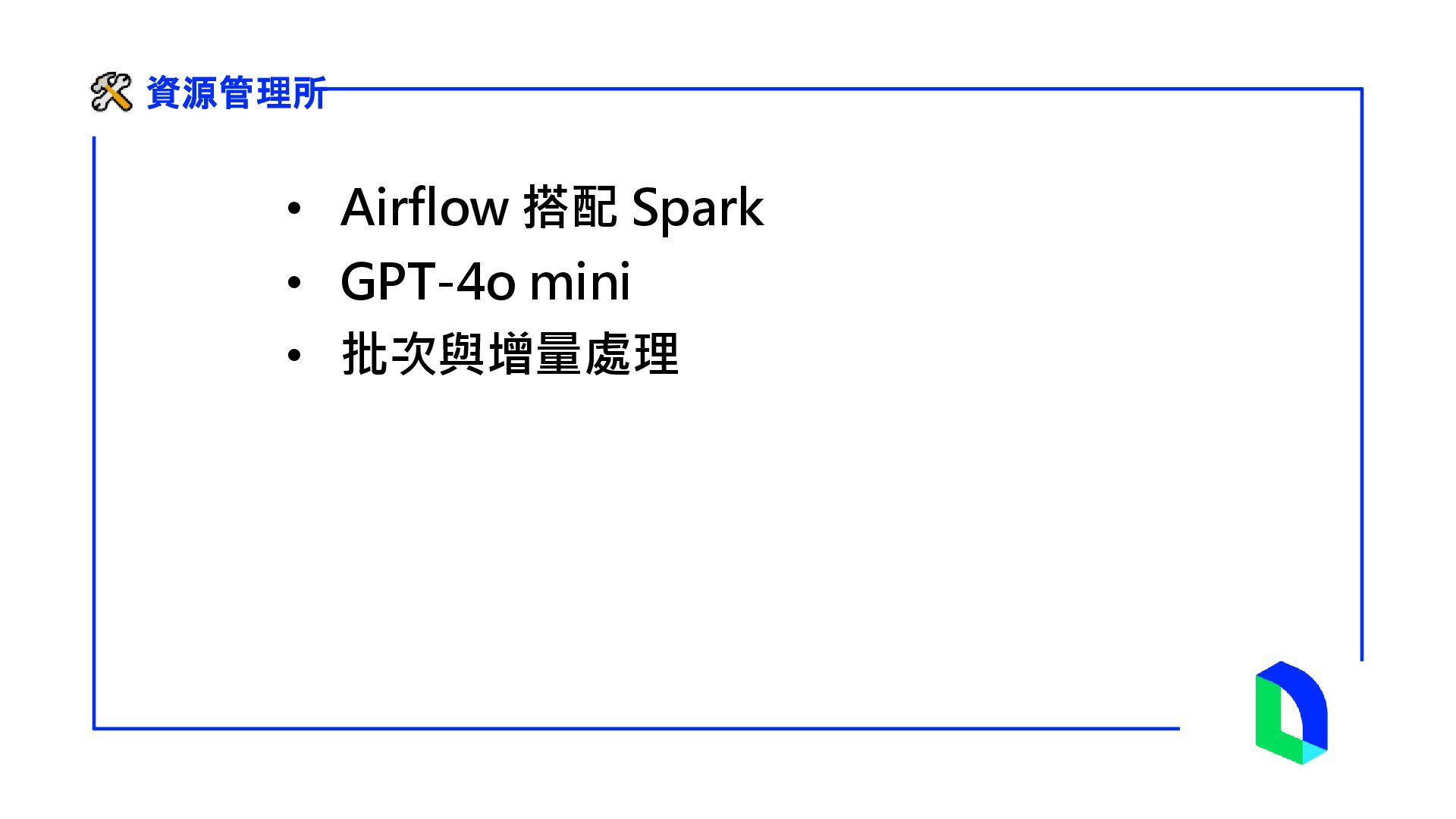 資源管理所 • Airflow 搭配 Spark • GPT-4o mini • 批次與增量處理