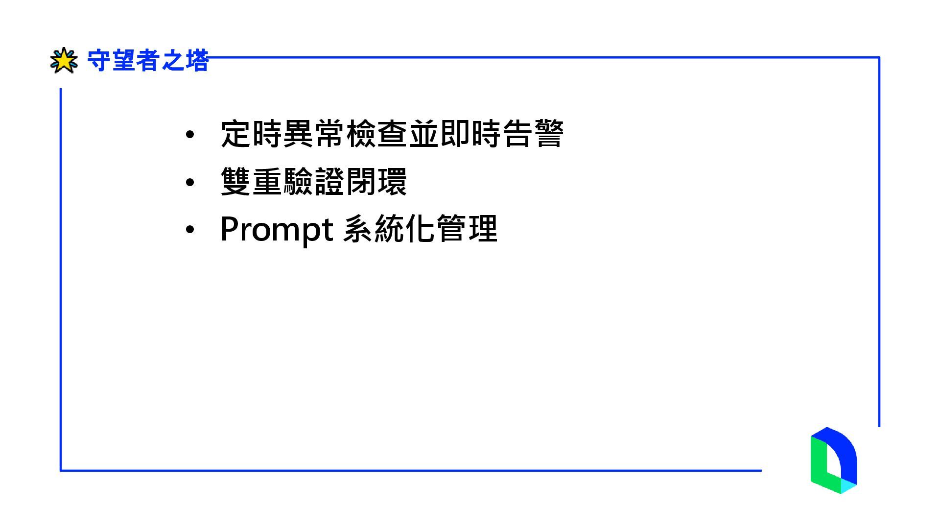 守望者之塔 • 定時異常檢查並即時告警 • 雙重驗證閉環 • Prompt 系統化管理