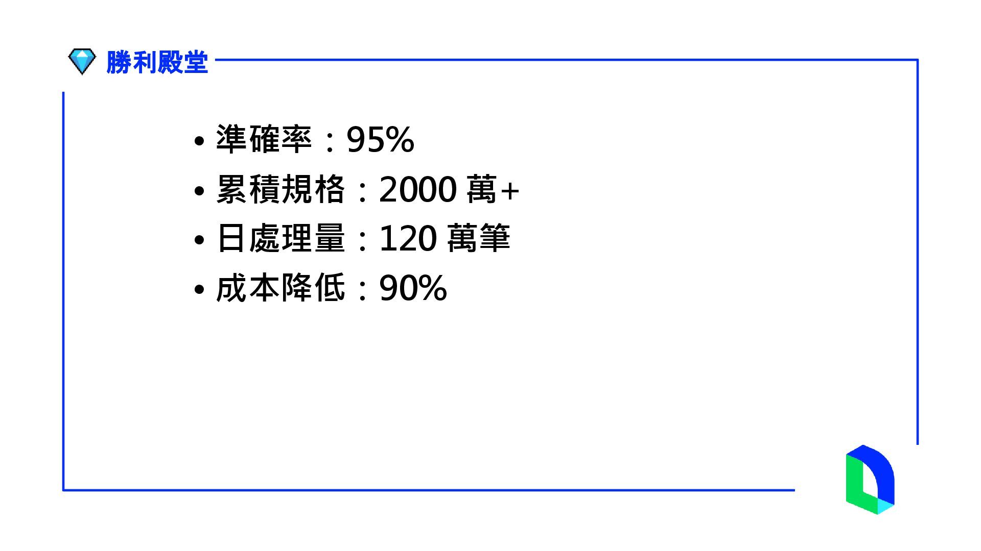 勝利殿堂 • 準確率:95% • 累積規格:2000 萬+ • 日處理量:120 萬筆 •
