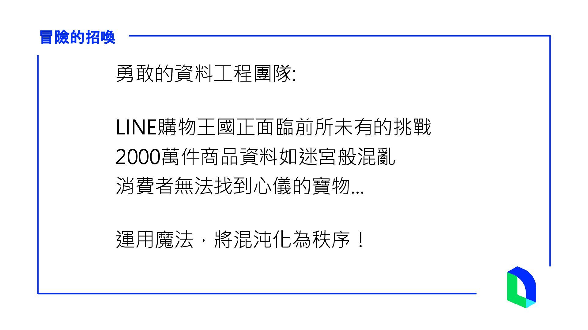 冒險的招喚 勇敢的資料工程團隊: LINE購物王國正面臨前所未有的挑戰 2000萬件商品資料如迷宮般混亂 消費者無法找到心儀的寶物... 運用魔法,將混沌化為秩序!
