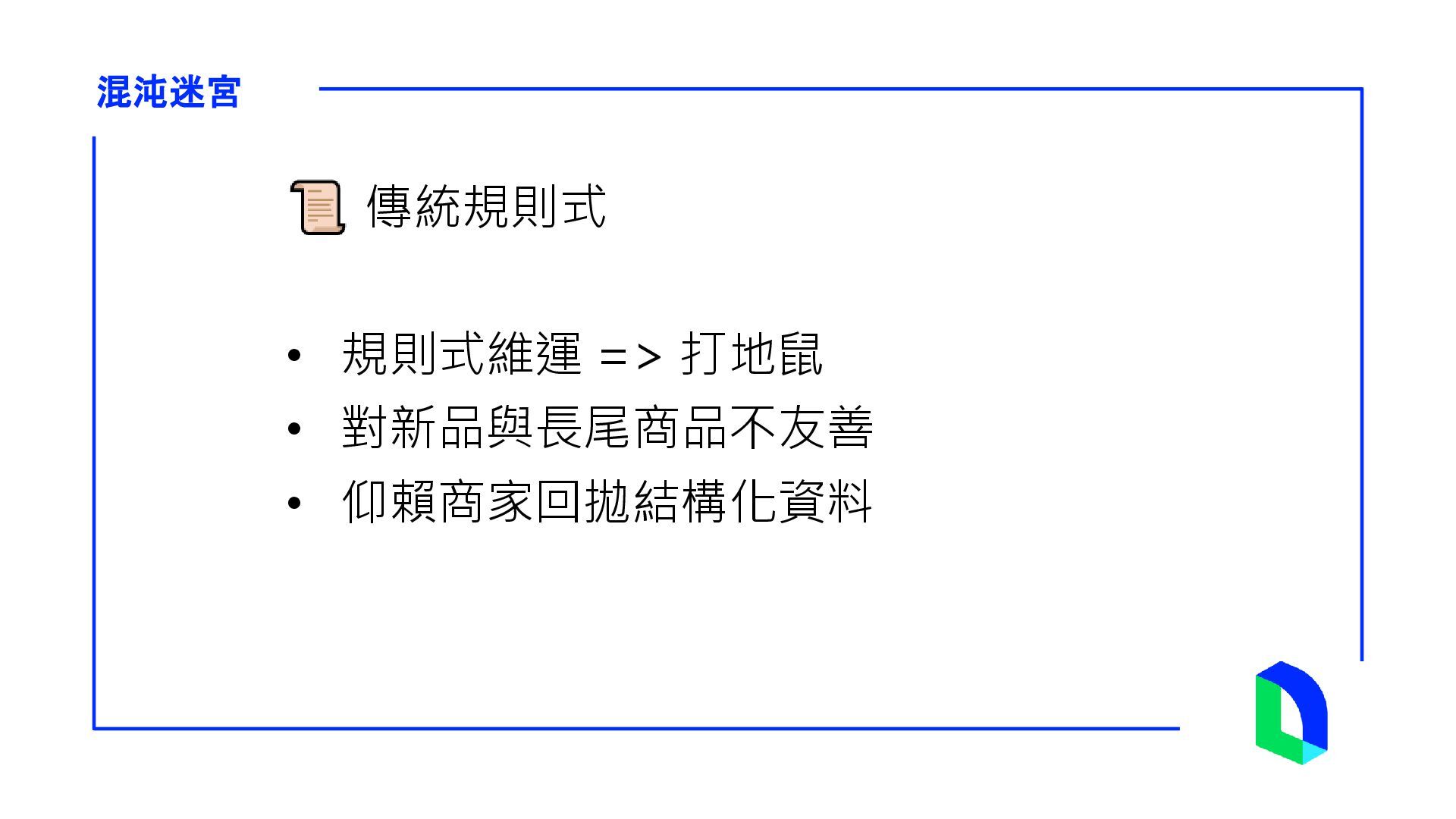 混沌迷宮 傳統規則式 • 規則式維運 => 打地鼠 • 對新品與長尾商品不友善 • 仰賴商家回拋結構化資料
