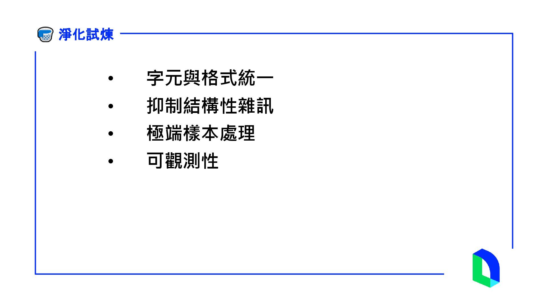 淨化試煉 • 字元與格式統一 • 抑制結構性雜訊 • 極端樣本處理 • 可觀測性