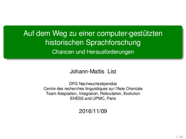 Herausforderungen Johann-Mattis List DFG Nachwuchsstipendiat Centre des recherches linguistiques sur l’Asie Orientale Team Adaptation, Integration, Reticulation, Evolution EHESS and UPMC, Paris 2016/11/09 1 / 45