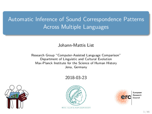 List Research Group “Computer-Assisted Language Comparison” Department of Linguistic and Cultural Evolution Max-Planck Institute for the Science of Human History Jena, Germany 2018-03-23 very long title P(A|B)=P(B|A)... 1 / 46