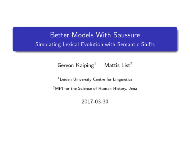do Closing Remarks References Context despite their popularity, methods for phylogenetic reconstruction are rarely tested, neither against gold standards (which do not really exist, the closest we have are phylogenies in databases like Glottolog [3]), nor against the results of simulation studies in the rare cases where phylogenetic methods have been tested with help of simulation studies [5, 2, 7, 6, 1], they were based on very simplistic models of lexical change that assume independent gain/loss of words or replacement of items Gereon Kaiping, Mattis List Better Models With Saussure