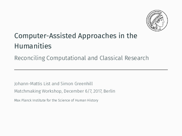data vs. small data problem and the challenge for computer science • foster a smart application of machine learning tools (no proof of concept but actual help for data-pre-processing in computer-assisted frameworks) • discuss generalizability of workflows for similar tasks (e.g., digitization) • improve computational training of scholars (with a focus on basic tasks like command line) • promote new scientific profiles (scholars who can bridge the gap and have training in classical and computational approaches)