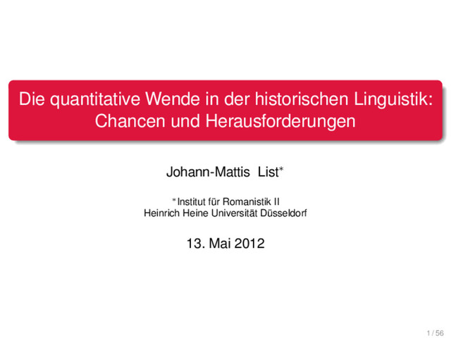 in der historischen Linguistik: Chancen und Herausforderungen Johann-Mattis List∗ ∗Institut für Romanistik II Heinrich Heine Universität Düsseldorf 13. Mai 2012 1 / 56