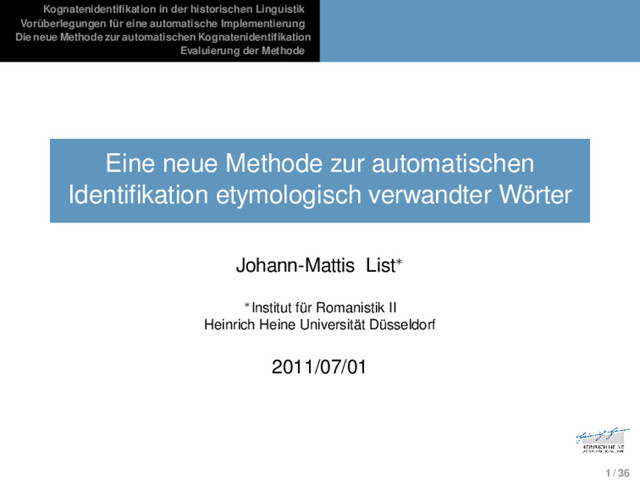 Die neue Methode zur automatischen Kognatenidentifikation Evaluierung der Methode Eine neue Methode zur automatischen Identifikation etymologisch verwandter Wörter Johann-Mattis List∗ ∗Institut für Romanistik II Heinrich Heine Universität Düsseldorf 2011/07/01 1 / 36