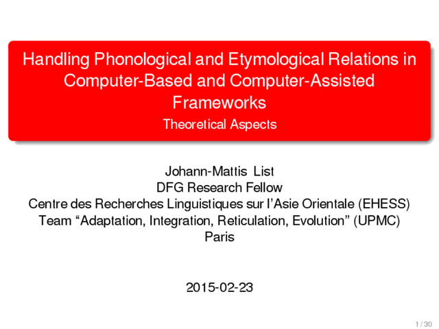 1–9, J anuary 5, 2015 ª 2015 The Authors http://dx.doi.org/10.1016/j.cub.2014.10.064 Article Detecting Regular Sound Changes in Linguistics as Events of Concerted Evolution Daniel J . Hruschka,1 Simon Branford,2 Eric D. Smith,3,4 J on Wilkins,3,5 Andrew Meade,2 Mark Pagel,2,3,* and Tanmoy Bhattacharya3,6,* 1School of Human Evolution and Social Change, Arizona State University, PO Box 872402, Tempe, AZ 85287-2402, USA 2SchoolofBiologicalSciences, UniversityofReading, Reading RG6 6BX, UK 3The Santa Fe Institute, 1399 Hyde Park Road, Santa Fe, NM 87501, USA 4Krasnow Institute for Advanced Study, George Mason University, Mail Stop 2A1, 4400 University Drive, Fairfax, VA 22030, USA 5Ronin Institute, 127 Haddon Place, Montclair, NJ 07043, USA 6T-2, Los Alamos National Laboratory, Los Alamos, NM 87545, USA Summary Background: Concerted evolution is normally used to describe parallel changes at different sites in a genome, but it is also observed in languages where a specif c phoneme changes to the same other phoneme in many words in the lexicon—a phenomenon known as regular sound change. We develop a general statistical model that can detect concerted changes in aligned sequence data and apply it to study regular sound changes in the Turkic language family. Results: Linguistic evolution, unlike the genetic substitutional process, is dominated by events of concerted evolutionary change. Our model identif ed more than 70 historical events ofregularsoundchangethatoccurredthroughouttheevolution of the Turkic language family, while simultaneously inferring a dated phylogenetic tree. Including regular sound changes yielded an approximately4-fold improvement in thecharacter- ization of linguistic change over a simpler model of sporadic change, improved phylogenetic inference, and returned more reliable and plausible dates for events on the phylogenies. The historical timings of the concerted changes closely follow a Poisson process model, and the sound transition networks derived fromour model mirror linguistic expectations. Conclusions: We demonstrate that a model with no prior knowledge of complex concerted or regular changes can nevertheless infer the historical timings and genealogical placements of events of concerted change from the signals left in contemporary data. Our model can be applied wherever discrete elements—such as genes, words, cultural trends, technologies, or morphological traits—can change in parallel within an organism or other evolving group. Introduction Concerted evolutionary change is widespread in genetic systems, being implicated in the genome-wide control of repetitive elements [1–3], the evolution of gene families [2], and homogenization of Y chromosome sequences [4, 5] and as a means by which asexual organisms might escape the debilitating consequences of Muller’s ratchet [3]. It might arise from several mechanisms, including homologous recombi- nation, that allow certain favorable elements to spread or damaging elements to be neutralized. Linguists have long recognized concerted change that affects copies of the same sound (or phoneme) appearing in different words as a central feature of linguistic evolution [6]. A well-known example is the *p> f sound change in the Germanic languages wherein an older Indo-European p sound was replaced by an f sound, such as in *pater> father, or *pes, *pedis> foot (linguistic convention is to use the ‘‘> ’’ symbol to indicate a transition from one sound to another, and here the * symbol denotes a reconstructed ancestral form). These multipleinstances ofonephonemechanging to thesameother phoneme yield regular sound correspondences between pairs or groups of languages. Linguists have proposed several explanations for the regularity of changes grounded in a number of basic processes, including speech production, perception, and cognition [7–9]. Can events of concerted change be detected statistically in sequence data, and do they improve the characterization of evolutionand theinferenceof evolutionaryhistories? Although previous researchers working in a linguistic setting have used the concept of regular changes to build algorithms for auto- matically inferring cognacy, to our knowledge the model we report here is the f rst probabilistic description of concerted change. This places concerted evolution in a statistical setting that allows for formal hypothesis testing about the nature and rates of concerted changes. For example, the question of how many parallel changes are required to be recognized as an instance of concerted change is naturally dealt with in our model: the statistical signature of concerted or regular change is that the multiple parallel events are more probable if treated as a single coordinated change than as a collection of inde- pendent changes (Box 1). Usefully, the genetic and linguistic phenomena share funda- mental properties relevant to their statistical characterization. Phonemes are the units of sound that make up words and distinguish one word from another, just as the four nucleotide bases (A, C, T, G) make up DNA gene sequences or the 20 amino acids make up protein sequences. The number of distinct sounds in a language varies greatly, but somewhere around 30–60 phonemes are commonly suff cient to describe the range of distinctive sounds in a language’s words [10]. Collections of words can therefore be thought of as providing phonemic ‘‘sequence information’’ that might be informative as to the history, rate, and patterns of concerted evolutionary change in language, and in a manner analogous to sequences of DNA. Data 26 Turkic languages 225 cognate sets from etymological dictionaries (Tower of Babel) manually compiled alignment analyses ASCII-encoding, 62 unique symbols Method Bayesian Markov chain Monte Carlo statistical model allowing for sporadic (irregular) and concerted (regular) changes along a phylogenetic tree that produces the alignments Output phylogenies, change