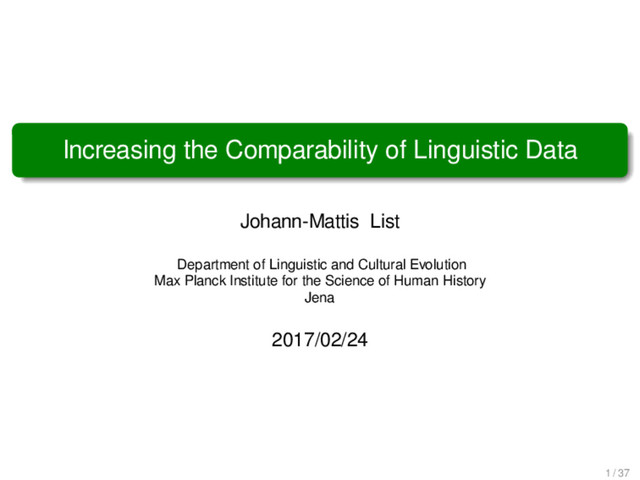 on many points in historical linguistics, be it the number of laryngeals, the position of Baltic and Slavic, or whether a given word was borrowed or not. We know well that no two etymological dictionaries for the same language or language families are completely identi- cal. Unfortunately, we lack a rigorous check to which de- gree experts actually agree or disagree in their judgments. We also lack methods for evaluation which would help us to show to which degree a given hypothesis (a reconstruction, a family tree, or an etymology) corresponds with our linguis- tic data. 10 / 37