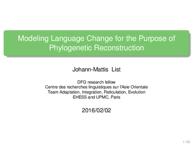 List DFG research fellow Centre des recherches linguistiques sur l’Asie Orientale Team Adaptation, Integration, Reticulation, Evolution EHESS and UPMC, Paris 2016/02/02 1 / 50