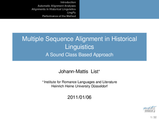of the Method Multiple Sequence Alignment in Historical Linguistics A Sound Class Based Approach Johann-Mattis List∗ ∗Institute for Romance Languages and Literature Heinrich Heine University Düsseldorf 2011/01/06 1 / 32