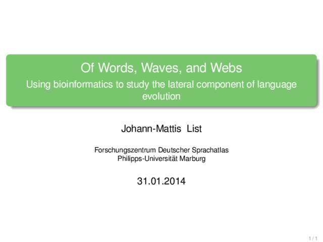 and Webs Using bioinformatics to study the lateral component of language evolution Johann-Mattis List Forschungszentrum Deutscher Sprachatlas Philipps-Universität Marburg 31.01.2014 1 / 1