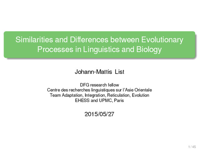 Johann-Mattis List DFG research fellow Centre des recherches linguistiques sur l’Asie Orientale Team Adaptation, Integration, Reticulation, Evolution EHESS and UPMC, Paris 2015/05/27 1 / 45