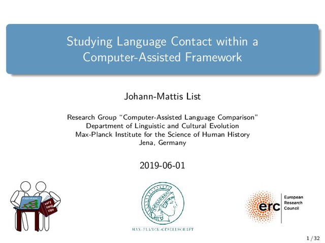 Group “Computer-Assisted Language Comparison” Department of Linguistic and Cultural Evolution Max-Planck Institute for the Science of Human History Jena, Germany 2019-06-01 very long title P(A|B)=P(B|A)... 1 / 32