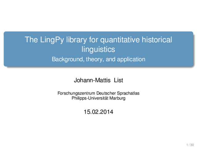 for quantitative historical linguistics Background, theory, and application Johann-Mattis List Forschungszentrum Deutscher Sprachatlas Philipps-Universität Marburg 15.02.2014 1 / 30