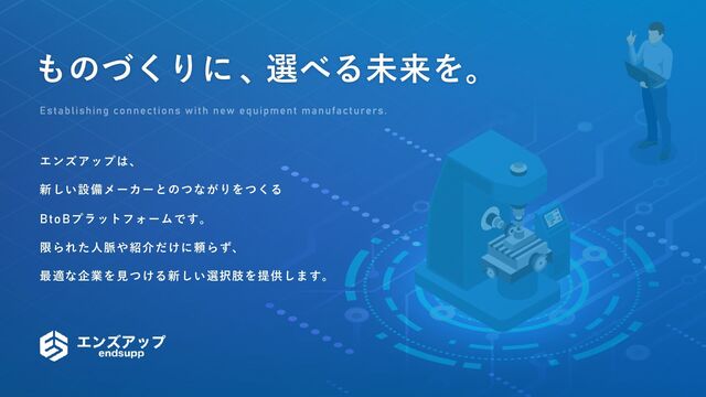 U P P i n c . 1 0 エンズアップを立ち上げた理由 「タクシーも買い物も仕事の探し方も変わったのに、 ものづくりのつながり方は、時代の変化を活かしきれていない。」 もう、限られた人脈の中だけで決める時代じゃない。 センサーやカメラの会社に19年いた元技術系営業マンと、 元制御系エンジニアで現生成AIエンジニアのおじさん2人は思った。 設備や装置の発注は、仕様が固まる前の相談から始まることが多い。 検索では限界があるからこそ、知っている会社に頼るしかなくなる。 でも、今のままで本当にいいのか? 「知っている会社がいる」 = 「最適な会社と出会えている」ではない。 だから、新しい選択肢をつくろう。 まだ形のない設備・装置の相談先を、最適な企業につなぐ。 10年後、日本のものづくりが、“変わる勇気”を持たなかったせいで停滞したなんて、笑えない。 09