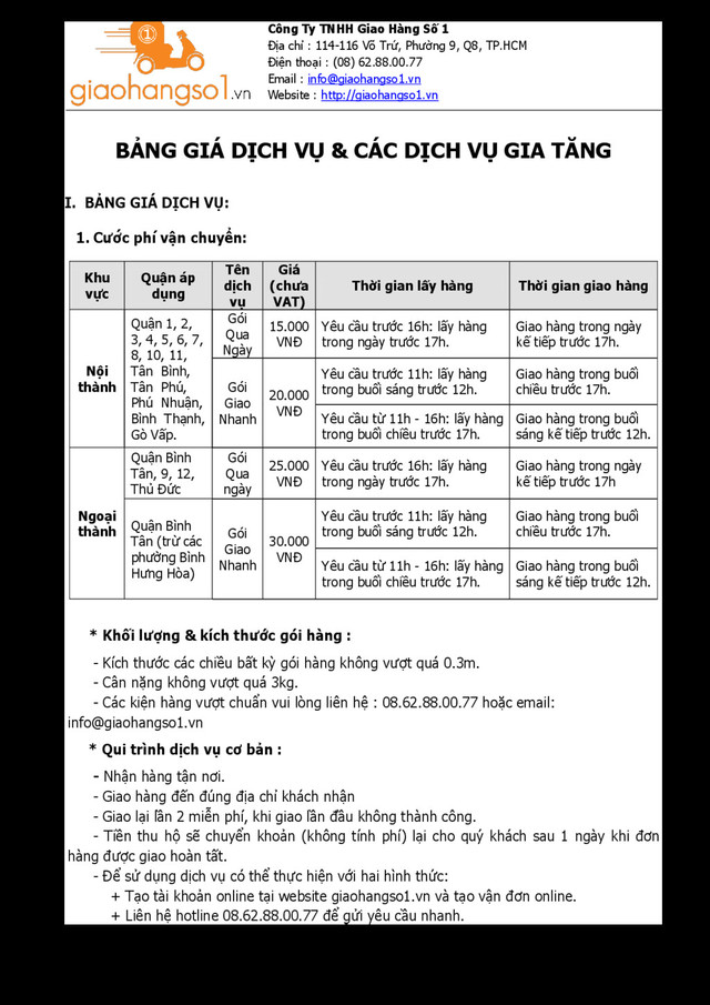 [email protected] Website : http://giaohangso1.vn BẢNG GIÁ DỊCH VỤ & CÁC DỊCH VỤ GIA TĂNG I. BẢNG GIÁ DỊCH VỤ: 1. Cước phí vâ ̣ n chuyê ̉ n: * Khối lượng & kích thước gói hàng : - Kích thước các chiều bất kỳ gói hàng không vượt quá 0.3m. - Cân nặng không vượt quá 3kg. - Các kiện hàng vượt chuẩn vui lòng liên hệ : 08.62.88.00.77 hoặc email: