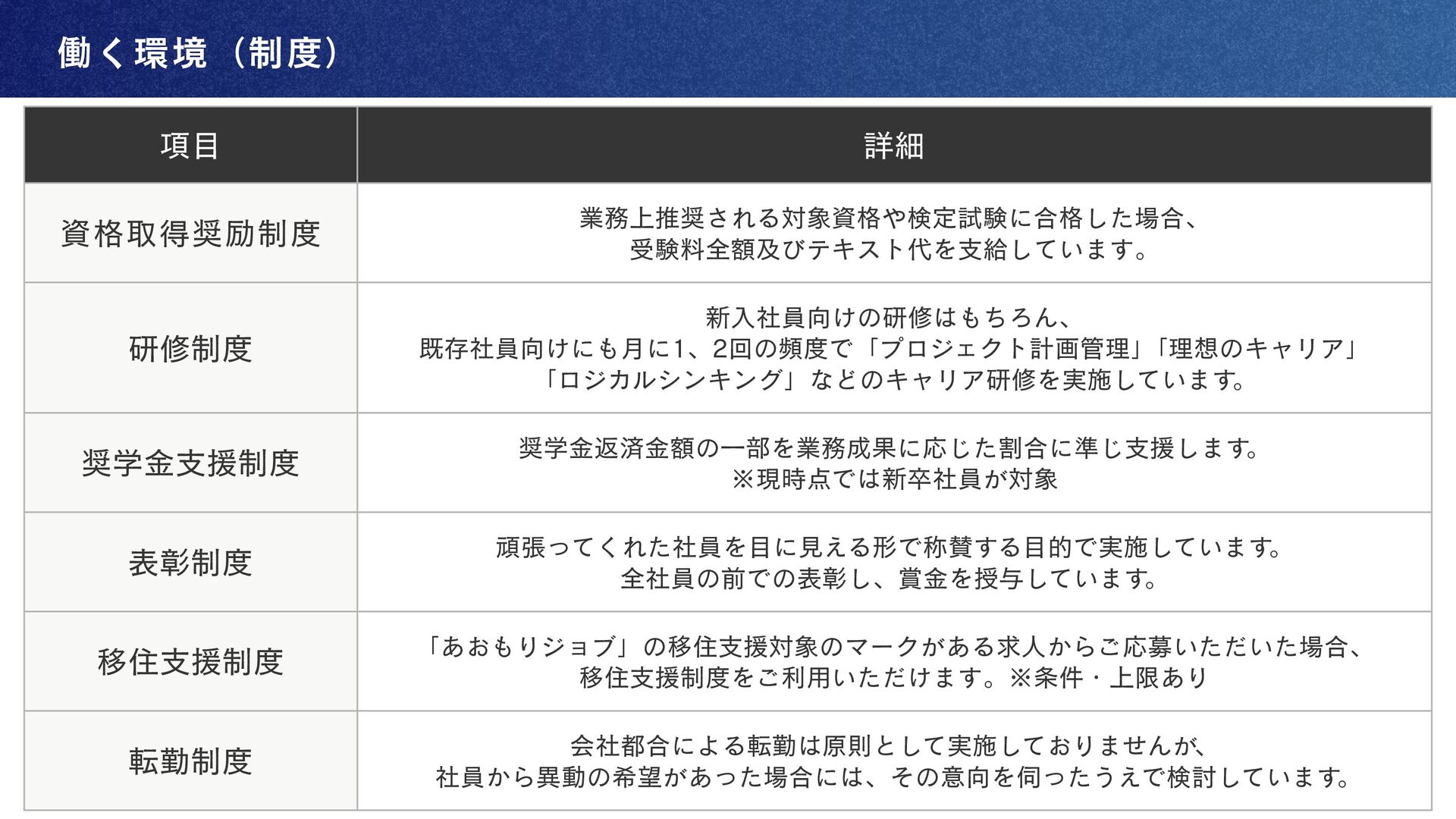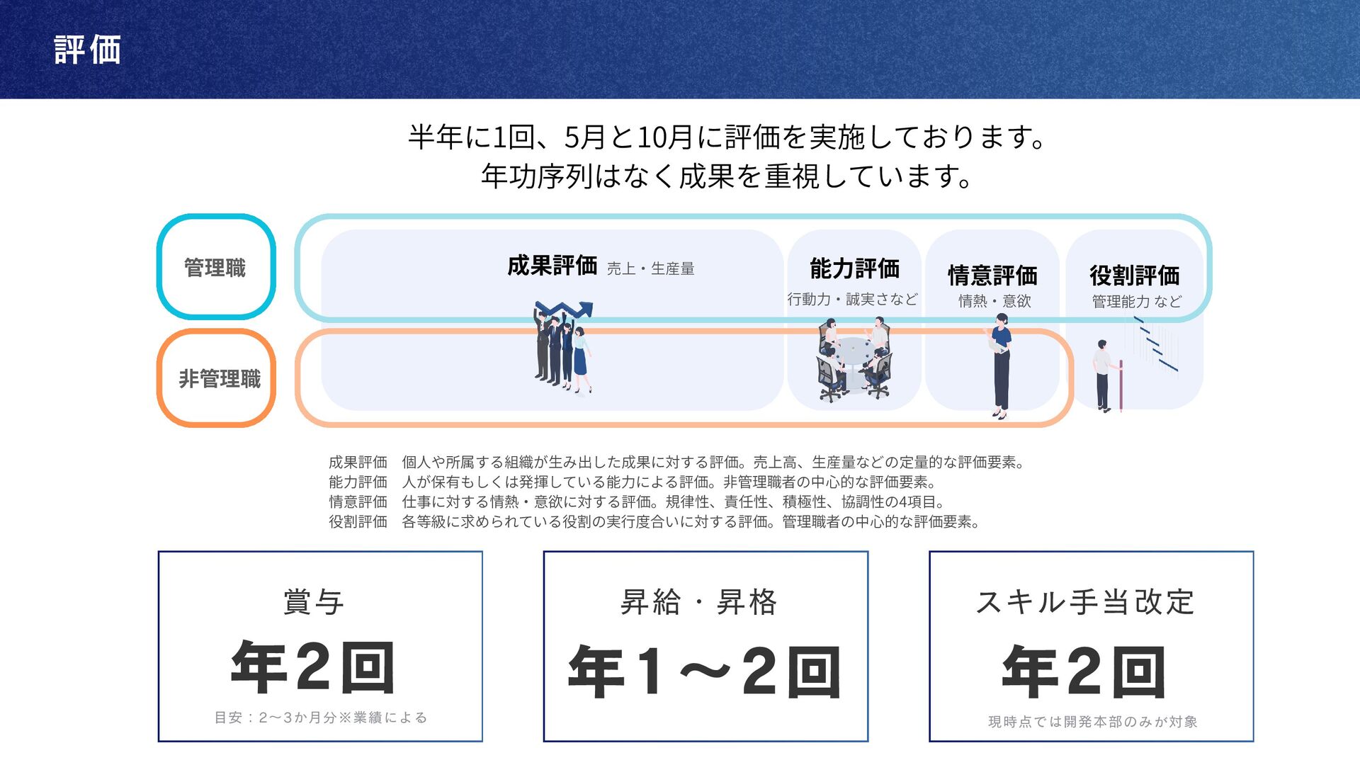 昇給・昇格 年1~2回 目安:2~3か月分※業績による スキル手当改定 年2回 現時点では開発本部のみが対象 半年に1回、5月と10月に評価を実施しております。 年功序列はなく成果を重視しています。 成果評価 個人や所属する組織が生み出した成果に対する評価。売上高、生産量などの定量的な評価要素。 能力評価 人が保有もしくは発揮している能力による評価。非管理職者の中心的な評価要素。 情意評価 仕事に対する情熱・意欲に対する評価。規律性、責任性、積極性、協調性の4項目。 役割評価 各等級に求められている役割の実行度合いに対する評価。管理職者の中心的な評価要素。 情熱・意欲 管理能力 など 行動力・誠実さなど