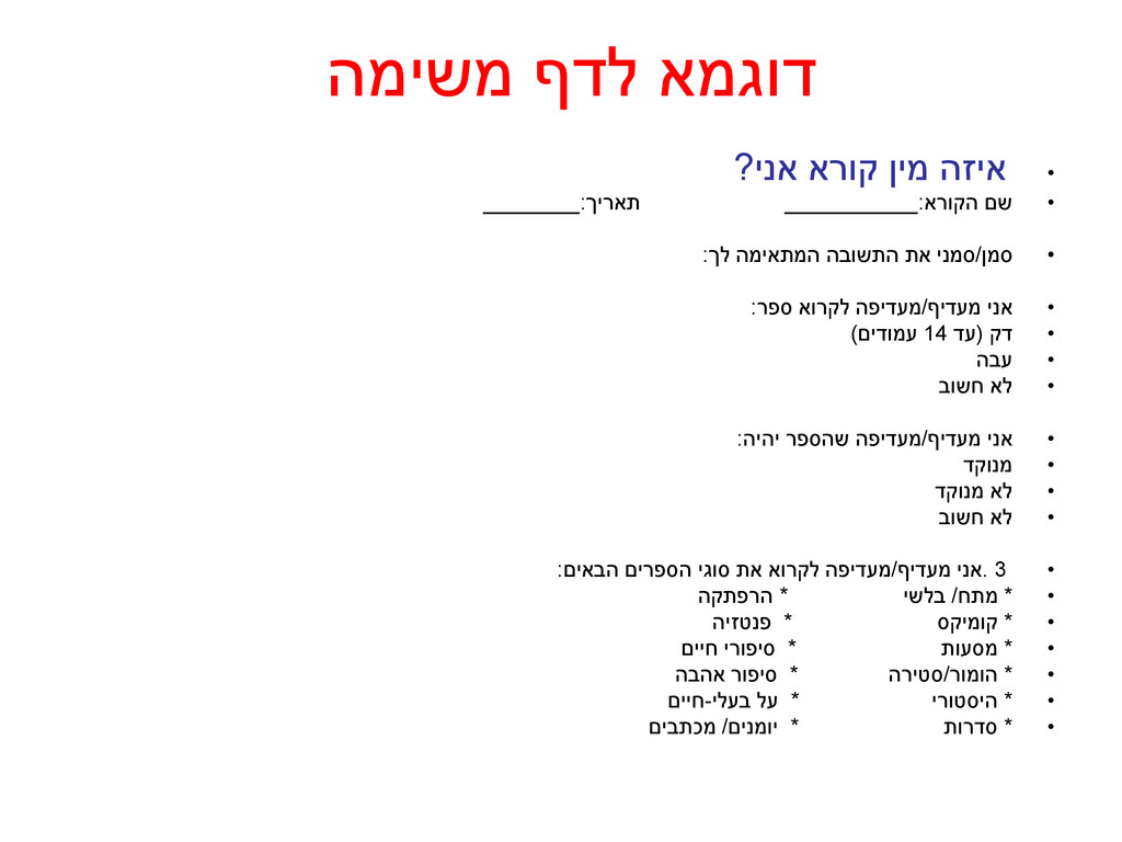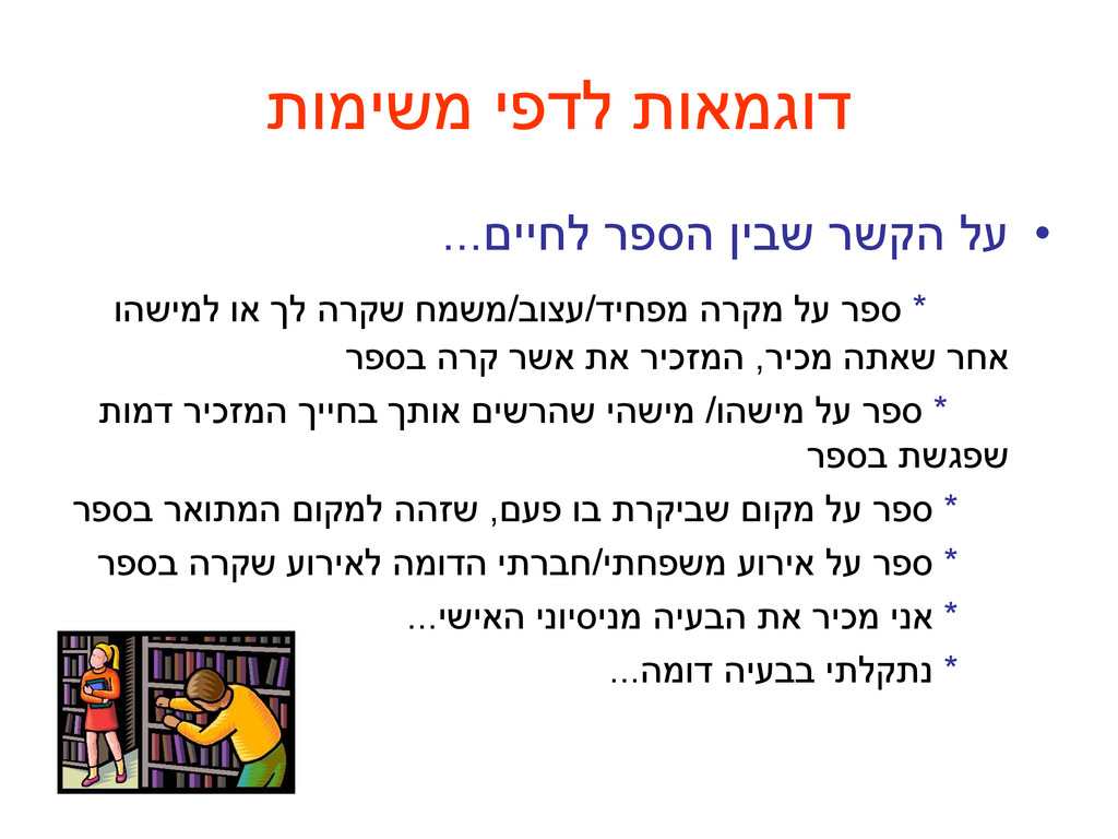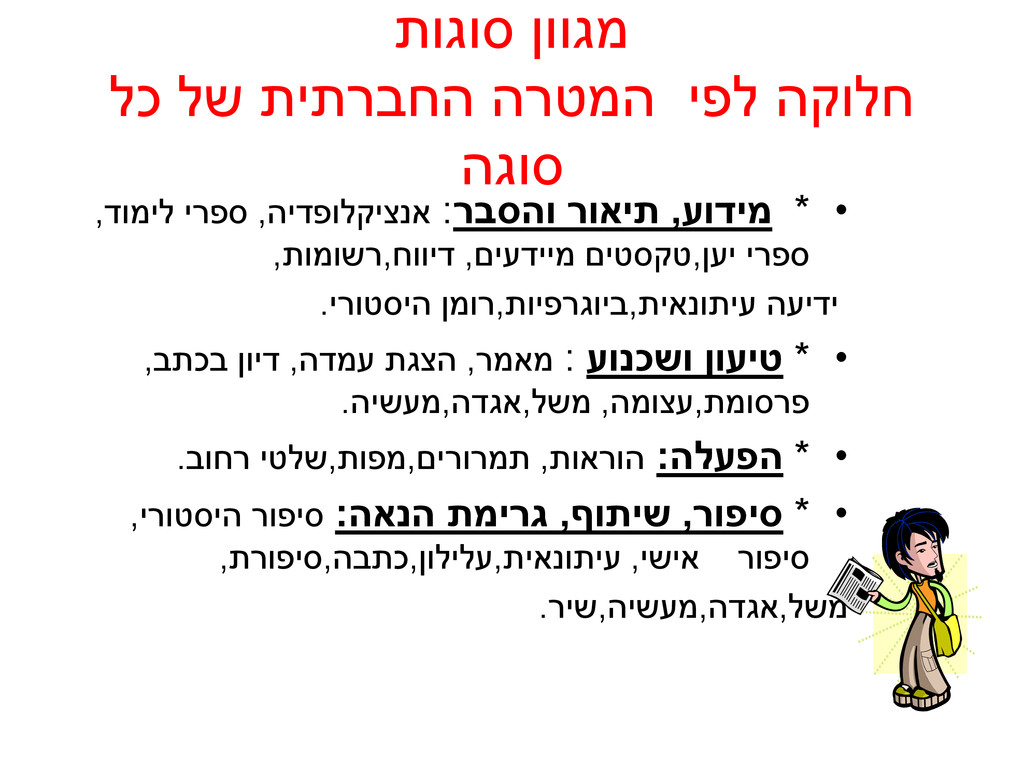 * עודימ , רבסהו רואית : הידפולקיצנא , דומיל ירפס , ןעי ירפס , םיעדיימ םיטסקט , חוויד , תומושר , תיאנותיע העידי , תויפרגויב , ירוטסיה ןמור . • * עונכשו ןועיט : רמאמ , הדמע תגצה , בתכב ןויד , תמוסרפ , המוצע , לשמ , הדגא , הישעמ . • * הלעפה : תוארוה , םירורמת , תופמ , בוחר יטלש . • * רופיס , ףותיש , האנה תמירג : ירוטסיה רופיס , ישיא רופיס , תיאנותיע , ןולילע , הבתכ , תרופיס , לשמ , הדגא , הישעמ , ריש .