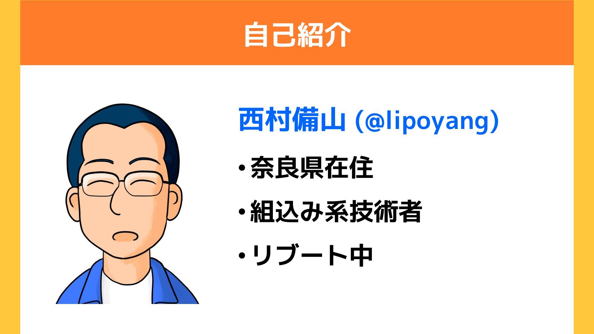 自己紹介 •奈良県在住 •組込み系技術者 •リブート中 西村備山 (@lipoyang)