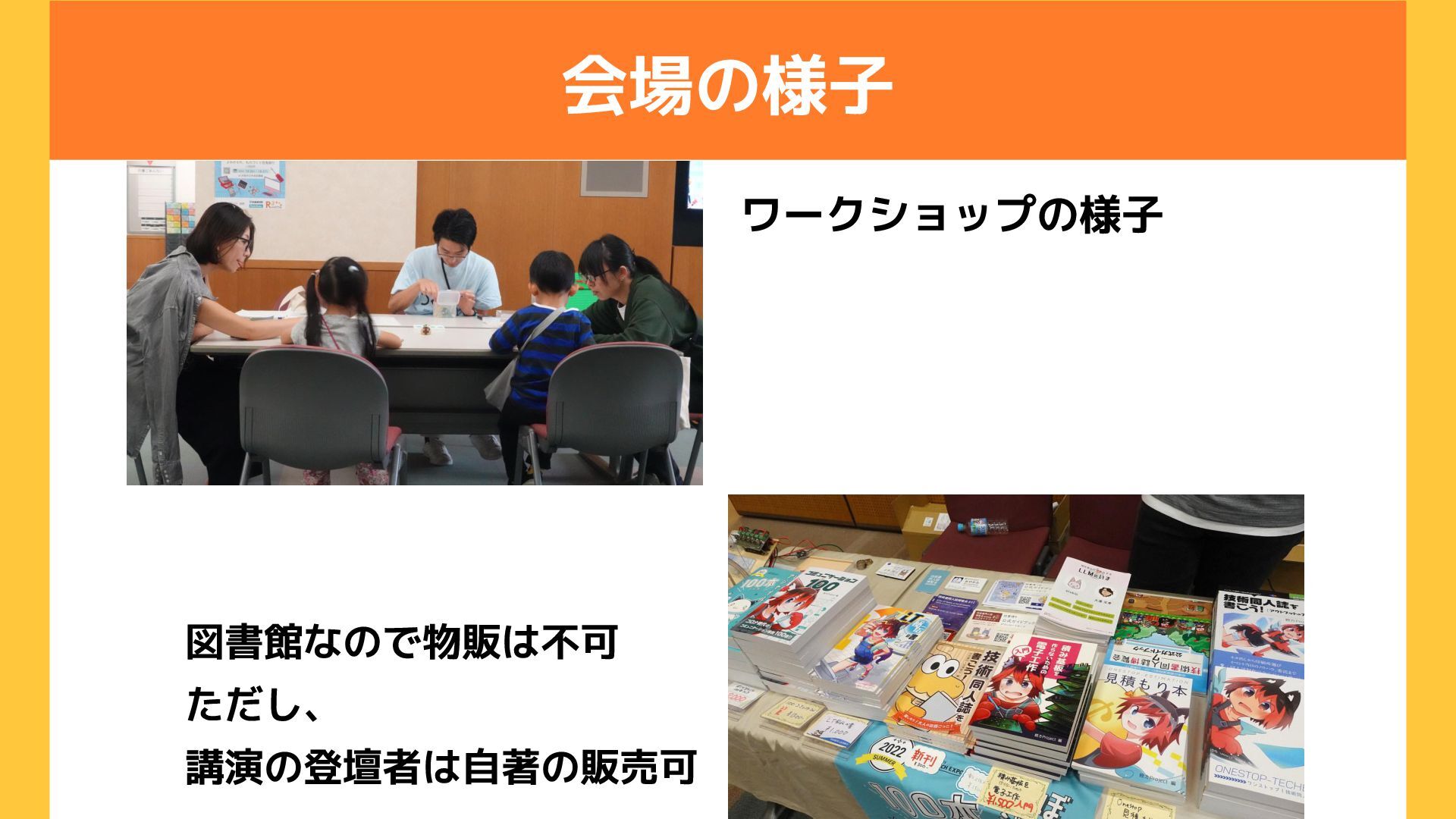 会場の様子 ワークショップの様子 図書館なので物販は不可 ただし、 講演の登壇者は自著の販売可