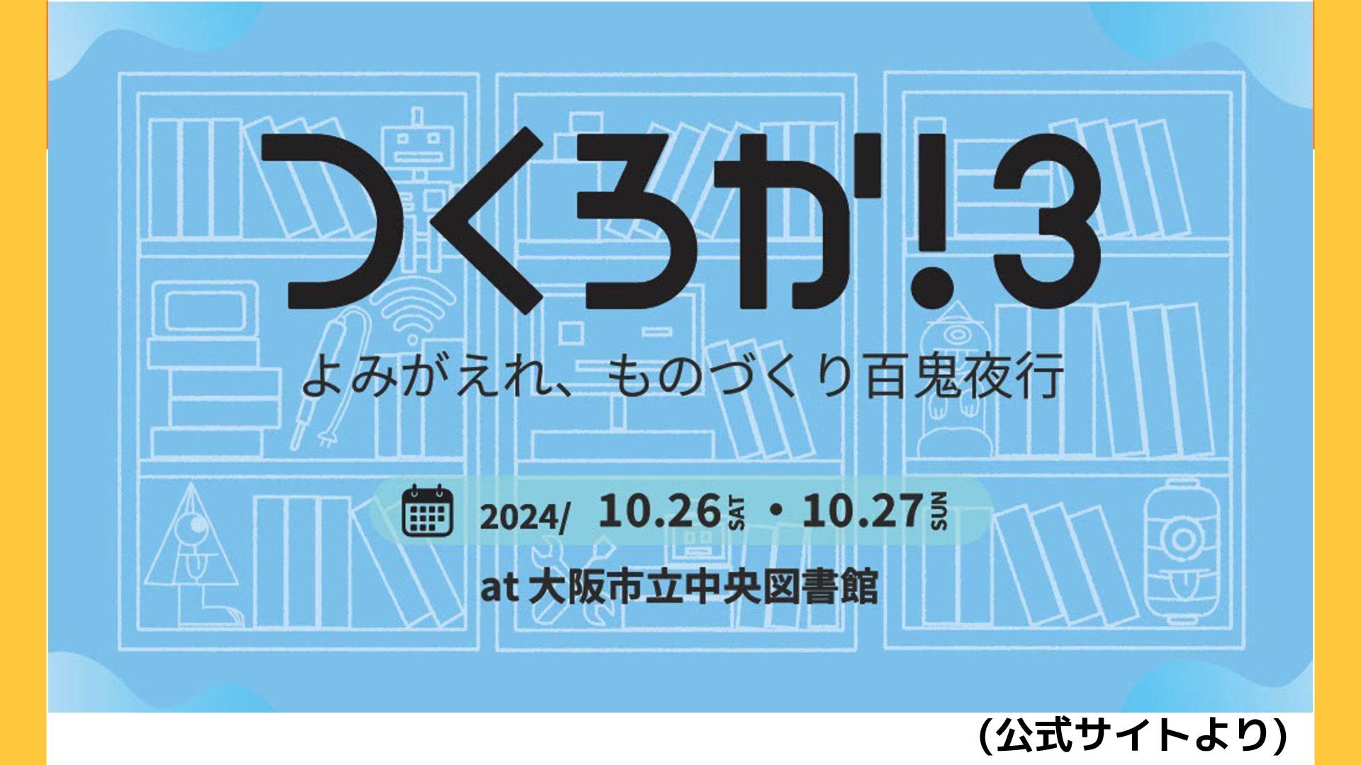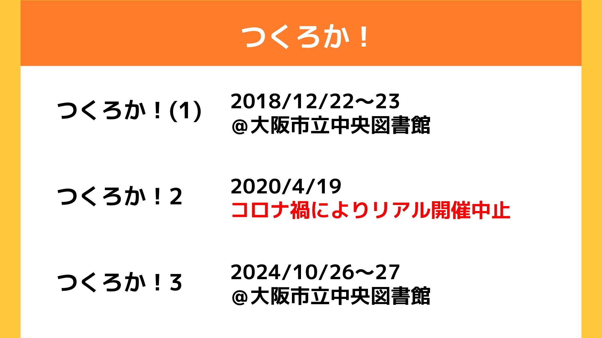 つくろか! つくろか!(1) 2018/12/22~23 @大阪市立中央図書館 つくろか!2 2020/4/19 コロナ禍によりリアル開催中止 つくろか!3 2024/10/26~27 @大阪市立中央図書館