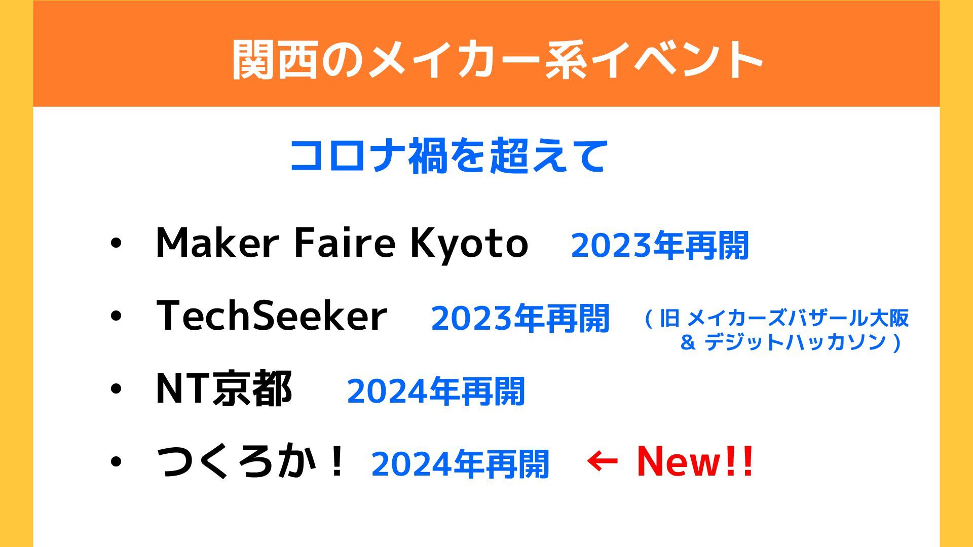 関西のメイカー系イベント • Maker Faire Kyoto 2023年再開 • TechSeeker 2023年再開 •