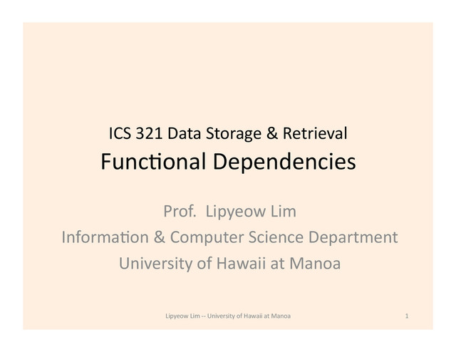 holds over rela8on R if, for every allowable instance r of R: – for all tuples t1,t2 in r, πX (t1) = πX (t2) implies πY (t1) = πY (t2) – i.e., given two tuples in r, if the X values agree, then the Y values must also agree. (X and Y are sets of aVributes.) • An FD is a statement about all allowable instances. – Must be iden8fied based on seman8cs of applica8on. – Given some allowable instance r1 of R, we can check if it violates some FD f, but we cannot tell if f holds over R! • K is a candidate key for R means that K -‐> R – However, K -‐> R does not require K to be minimal! Lipyeow Lim -‐-‐ University of Hawaii at Manoa 3