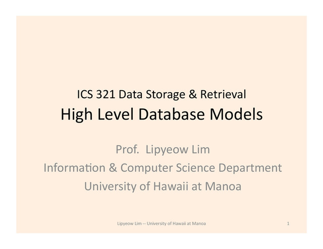(aka ER) model represented pictorially as ER diagrams – Map ER model to relaConal schema • QuesCons to ask yourself – What are the enCCes and relaConships in the applicaCon? – What informaCon about these enCCes and relaConships should we store in the database? – What are the integrity constraints or business rules that hold? Lipyeow Lim -‐-‐ University of Hawaii at Manoa 3