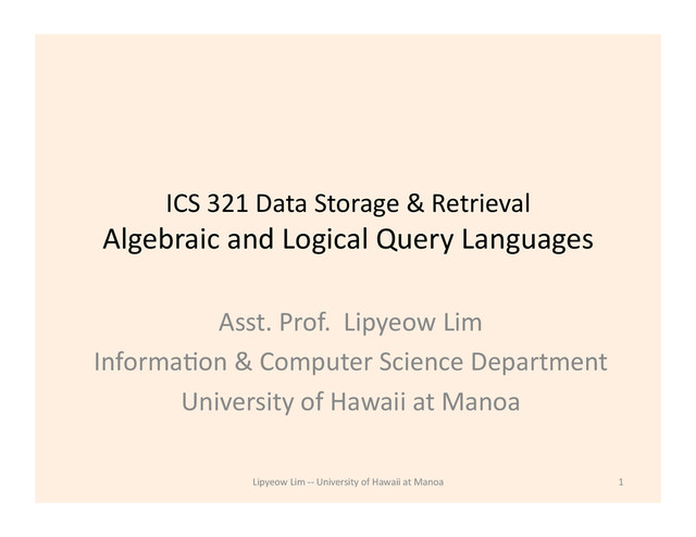Query Languages Asst. Prof. Lipyeow Lim InformaDon & Computer Science Department University of Hawaii at Manoa 1 Lipyeow Lim -‐-‐ University of Hawaii at Manoa