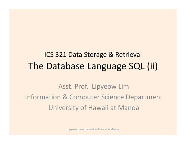 both a red and a green boat Lipyeow Lim -‐-‐ University of Hawaii at Manoa 3 SELECT S1.sname FROM Sailors S1, Reserves R1, Boats B1 WHERE S1.sid=R1.sid AND R1.bid=B1.bid AND ( B1.color=`red’ OR AND B1.color=`green’) SELECT S1.sname FROM Sailors S1, Reserves R1, Boats B1, Reserves R2, Boats B2 WHERE S1.sid=R1.sid AND R1.bid=B1.bid AND S1.sid=R2.sid AND R2.bid=B2.bid AND B1.color=`red’ AND B2.color=`green’