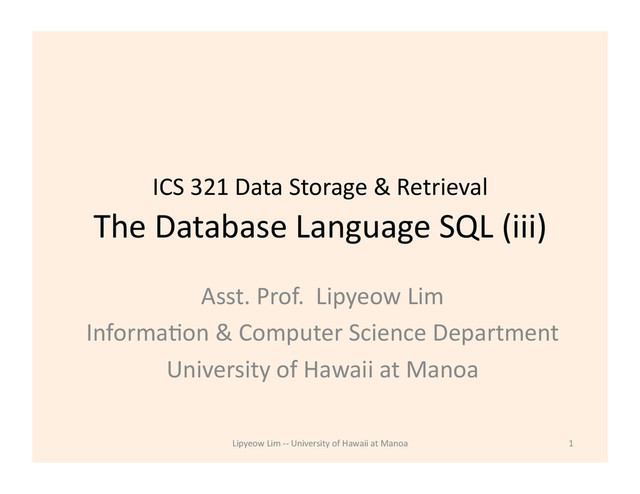 duplicates by default, unless DISTINCT is given. • Set operators UNION, INTERSECT, EXCEPT use set semanFcs by default! • To use bag semanFcs: UNION ALL, INTERSECT ALL, EXCEPT ALL. Lipyeow Lim -‐-‐ University of Hawaii at Manoa 2 (SELECT title, year FROM Movies) UNION ALL (SELECT movieTitle AS title, movieYear AS year FROM StarsIn)