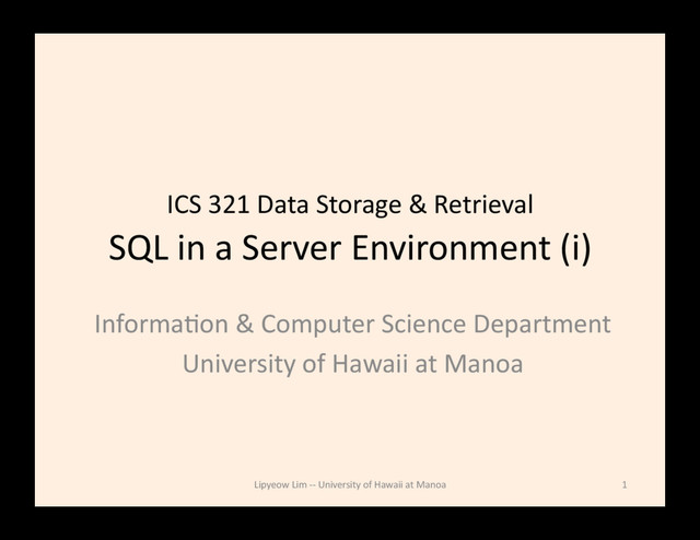 – How do I program such applica<ons? – SQL environment – Programming language environment (eg. Java) – Web-‐based applica<ons ? • Systems perspec<ve – How do I setup the system(s)? – Is applica<on program on the same machine as DBMS? – How does applica<on program “talk” to the DBMS server ? Lipyeow Lim -‐-‐ University of Hawaii at Manoa 2