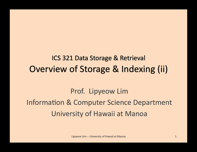 & Indexing (ii) Prof. Lipyeow Lim InformaBon & Computer Science Department University of Hawaii at Manoa 1 Lipyeow Lim -‐-‐ University of Hawaii at Manoa