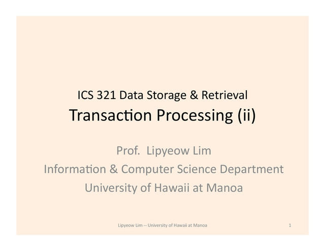 in the Aries recovery algorithm: – Analysis: Scan the log forward (from the most recent checkpoint) to iden8fy all Xacts that were ac8ve, and all dirty pages in the buffer pool at the 8me of the crash. – Redo: Redoes all updates to dirty pages in the buffer pool, as needed, to ensure that all logged updates are in fact carried out and wricen to disk. – Undo: The writes of all Xacts that were ac8ve at the crash are undone (by restoring the before value of the update, which is in the log record for the update), working backwards in the log. (Some care must be taken to handle the case of a crash occurring during the recovery process!) Lipyeow Lim -‐-‐ University of Hawaii at Manoa 10