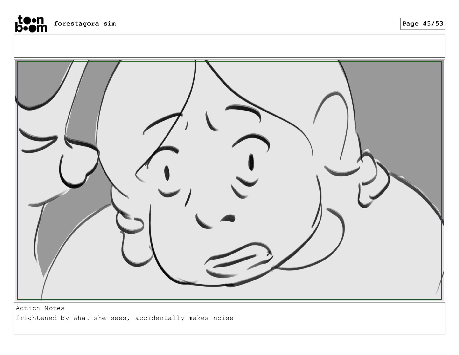 Action Notes frightened by what she sees, accidentally makes noise